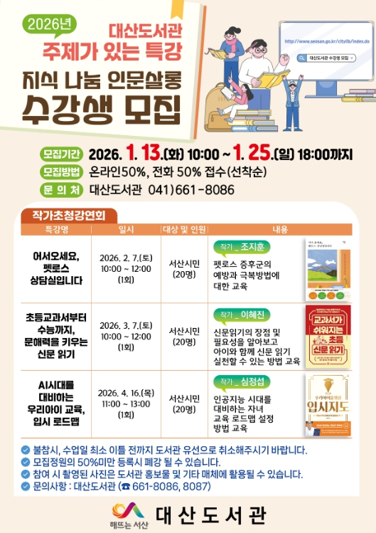 이번 특강은 서산시민을 대상으로 2월부터 4월까지 매월 1회 반려동물을 잃은 슬픔을 건강하게 대처하는 심리적 회복방법에 대해 나누는 ▲어서오세요, 펫로스 상담실입니다 조지훈 작가 초청 강연회, 자녀와 함께 신문을 활용한 문해력 향상 방법을 소개하는 ▲초등교과서부터 수능까지, 문해력을 키우는 신문 읽기 이혜진 작가 초청 강연회, 인공지능 시대에 필요한 자녀의 진로 설계 및 학습 전략을 안내하는 ▲AI시대를 대비하는 우리아이 교육, 입시 로드맵 심정섭 작가 초청 강연회까지 3개 특강이 진행된다.