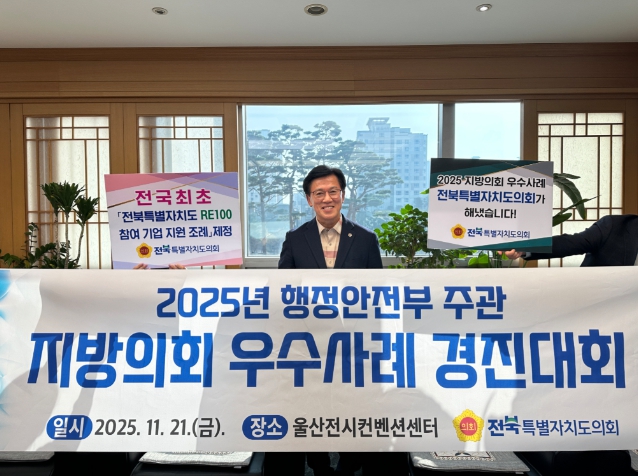 [메이저뉴스]전북특별자치도의회가 지난 21일 울산전시컨벤션센터에서 열린 행정안전부 주관 ‘2025년 지방의회 우수사례 경진대회’에서 본선에 진출해 수상하는 영예를 안았다.