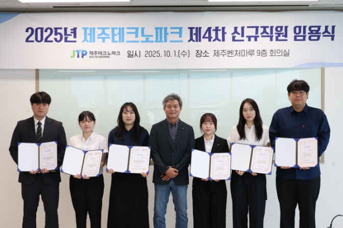 [메이저뉴스] 제주테크노파크(원장 지영흔, 제주TP)가 1일 제주벤처마루 9층 회의실에서 6명의 신규직원에게 임명장을 수여했다.