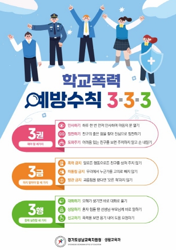 한양수 교육장은 “이번 ‘학교폭력예방수칙 3·3·3’은 학생들의 일상 속 행동 변화를 이끌기 위한 실천형 예방지침”이라며