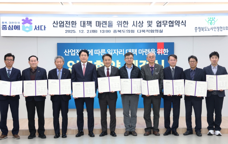[메이저뉴스] 충청북도노사민정협의회(위원장 김영환)는 2일 충청북도의회 다목적회의실에서 산업전환 업무협약 및 시상식·토론회를 개최하고, 산업구조 변화에 따른 고용불안에 선제적 대응을 위한 노·사·민·정 상생협력 체계를 강화했다.