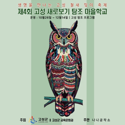 ‘새로보기 탐조 마을학교’는 고성의 천연기념물과 철새를 직접 관찰하며 환경의 가치를 이해하고 생태 보전 의식을 높이는 주민 자율형 프로그램으로, 철새 탐조 활동, 생태 예술 체험, 전문가 강연 등 총 10회 과정으로 운영된다.