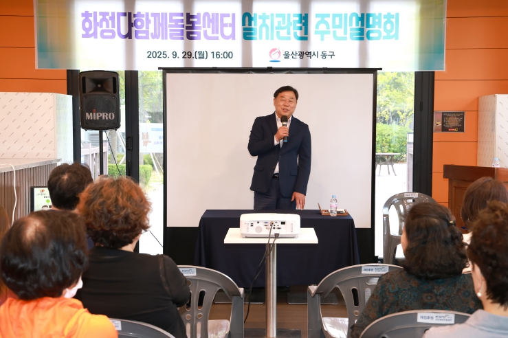 [메이저뉴스]울산 동구는 9월 29일 오후 4시 힐스테이트 이스턴베이 1층 카페테리아에서 김종훈 동구청장과 주민 50여명이 참석한 가운데 ‘화정다함께돌봄센터’ 설치와 관련해 주민설명회를 개최했다.