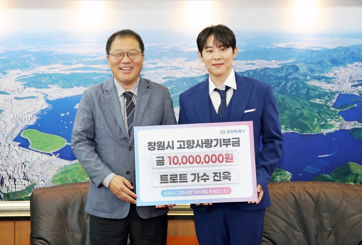 [메이저뉴스] 창원특례시는 29일 시청 접견실에서 트로트 가수 진욱이 ‘진해 벚꽃 소생 프로젝트’에 1,000만 원을 기부하고 기탁식을 가졌다고 밝혔다.