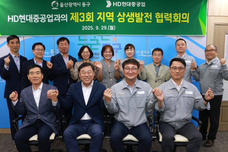 [메이저뉴스]울산 동구청과 HD현대중공업은 9월 29일 오전 11시 동구청장실에서 ‘제3회 지역 상생발전 협력회의’를 개최했다. 이날 회의에는 김종훈 동구청장과 HD현대중공업 김상회 전무를 비롯한 양측 간부 공무원과 임직원이 참석했다.