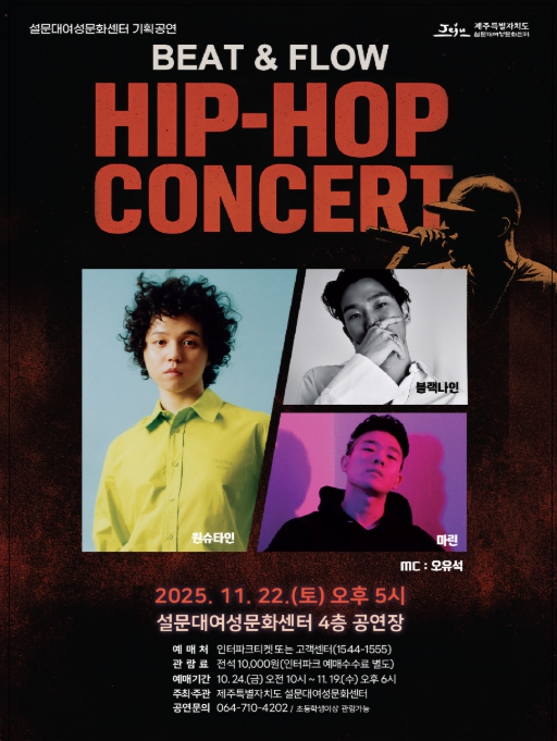 [메이저뉴스]제주특별자치도 설문대여성문화센터는 ‘설문대 문화의 날’ 11월 기획공연으로 ‘원슈타인·블랙나인·마린 힙합콘서트’를 11월 22일 오후 5시에 공연장에서 선보인다고 밝혔다.