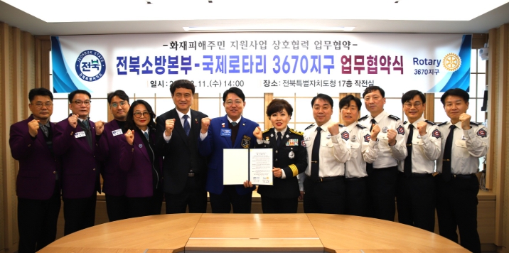 [메이저뉴스]전북특별자치도소방본부는 11일 국제로타리 3670지구(총재 김성희)와 화재피해주민 지원사업의 원활한 추진을 위한 상호협력 업무협약을 체결했다고 밝혔다.