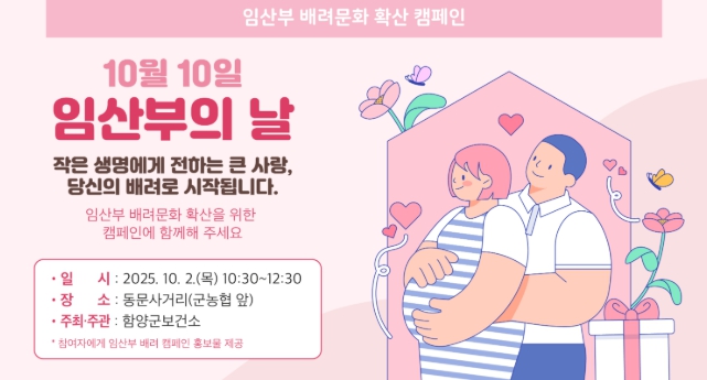 [메이저뉴스]함양군은 오는 10월 2일 함양읍 일원에서 ‘2025 임산부의 날 기념 캠페인’을 개최한다. 이번 캠페인은 임산부에 대한 존중과 배려 문화를 확산하고, 군민의 인식 개선과 공감대 형성을 위해 마련됐다.