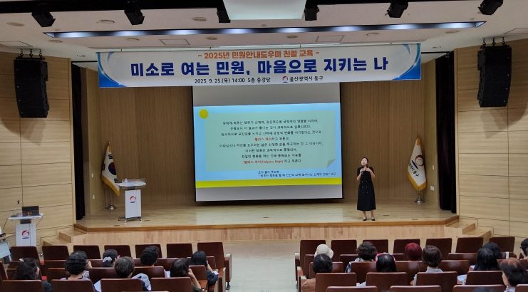 [메이저뉴스]울산 동구는 9월 25일 동구청 5층 중강당에서 구청과 보건소, 종합사회복지관의 자원봉사 민원 안내 도우미 60여 명을 대상으로 친절 교육을 했다.