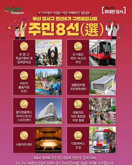 [메이저뉴스]부산 강서구는 민선8기 3년간 추진한 주요 사업 가운데 주민이 직접 선정한 ‘주민 8선(選)’을 발표했다. 이번 조사는 지난 8월 14일부터 9월 13일까지 구 홈페이지(PC 또는 모바일)를 통한 온라인 설문 방식으로 진행됐으며, 총 4,745명이 참여해 큰 관심을 모았다.