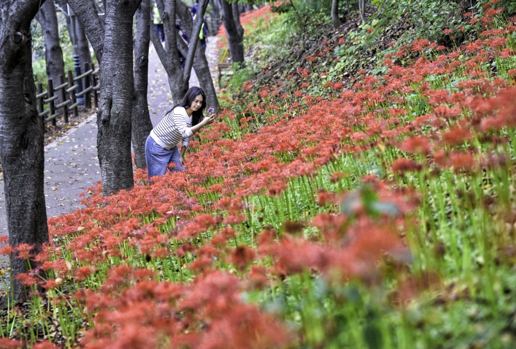 [메이저뉴스] 울산 남구 선암호수공원이 가을을 붉게 수놓은 꽃무릇으로 물들고 있다.