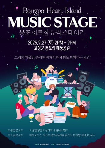 [메이저뉴스]고성군과 고성문화재단은 오는 9월 27일 토요일 오후 2시부터 밤 9시까지 토성면 봉포리 해풍공원에서 ‘제3회 봉포하트섬 뮤직 스테이지’를 개최한다.