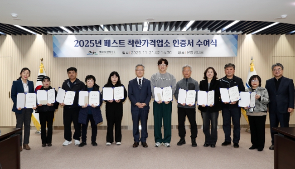 [메이저뉴스]제주특별자치도는 도내 최초로 ‘2025년 베스트 착한가격업소’ 15개소를 선정하고 21일 인증서 수여식을 개최했다.