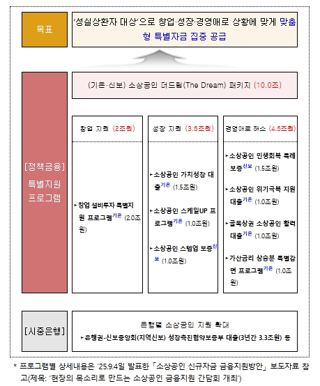 지난 ’25.9.4일 금융위는 성실상환 소상공인을 대상으로 창업, 성장, 경영애로 등 상황에 맞는 특별자금을 공급하는 10조원 규모의 ‘소상공인 더드림(The Dream) 패키지’를 발표한 바 있다. 대책발표 이후, 준비 과정을 거쳐 각 상품을 순차적으로 출시하고 있으며, 최근(11.7일) 마지막 2개 상품, 기업은행의 ‘소상공인 가치성장대출(1.5조원)’과 ‘골목상권 소상공인 활력대출(1.0조원)을 출시하였다.
