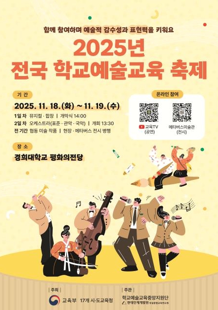 [메이저뉴스]교육부와 17개 시‧도교육청은 11월 18일부터 11월 19일까지 경희대학교 평화의전당(서울)에서 2025년 전국 학교예술교육 축제를 개최한다.