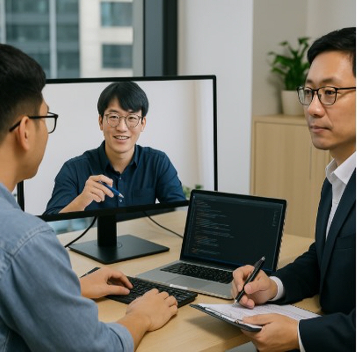 | ▲ 서울에서 진행된 한국어 가능한 BA와 스타트업 고객 간의 미팅 장면이며, 베트남 개발자가 화면을 통해 원격으로 참여하고 있다. (출처: OpenAI 챗GPT) |