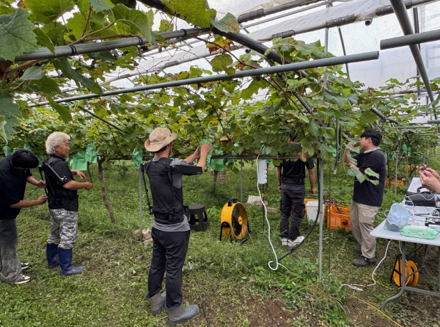 | ▲ 지난 30일, 관내 포도재배농가에서 웨어르블로봇 ‘엑스블 숄더’를 착용하고 생체역학적 평가를 진행하고 있다. |