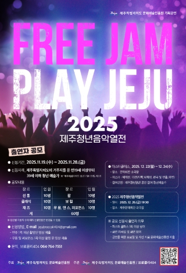 2025 제주청년음악열전은 제주도에 주소를 둔 19세부터 39세의 청년예술가라면 누구나 신청할 수 있으며, 연주 및 퍼포먼스 영상은 1곡 분량으로 이메일으로 제출하면 된다. 결과는 12월 9일 오후 2시 문화예술진흥원 누리집에 공개된다.