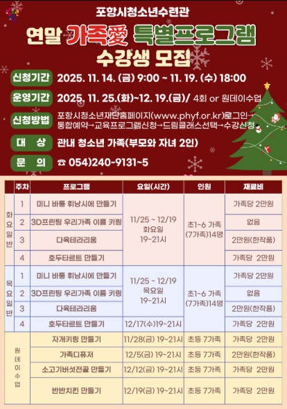 최제민 포항시청소년재단 대표이사는 “연말은 가족이 함께 지난 한 해를 돌아보고 서로에게 감사의 마음을 전하기 좋은 시기”라며 “부모와 자녀가 함께 하는 시간을 마련하고 수업 참여를 통해 성취감을 느끼는 계기가 되길 바란다”고 전했다.