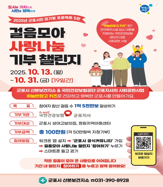 [메이저뉴스]군포시 산본보건지소는 오는 10월 13일부터 31일까지(19일간) 국민건강보험공단 군포지사와 함께하는 '걸음모아 사랑나눔' 기부챌린지를 운영한다.