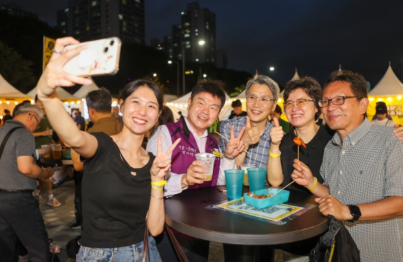 | ▲ ‘2025 동대문구 맥주축제’를 즐기는 가족과 이필형 동대문구청장(보라색조끼)이 기념촬영을 하고 있다 |