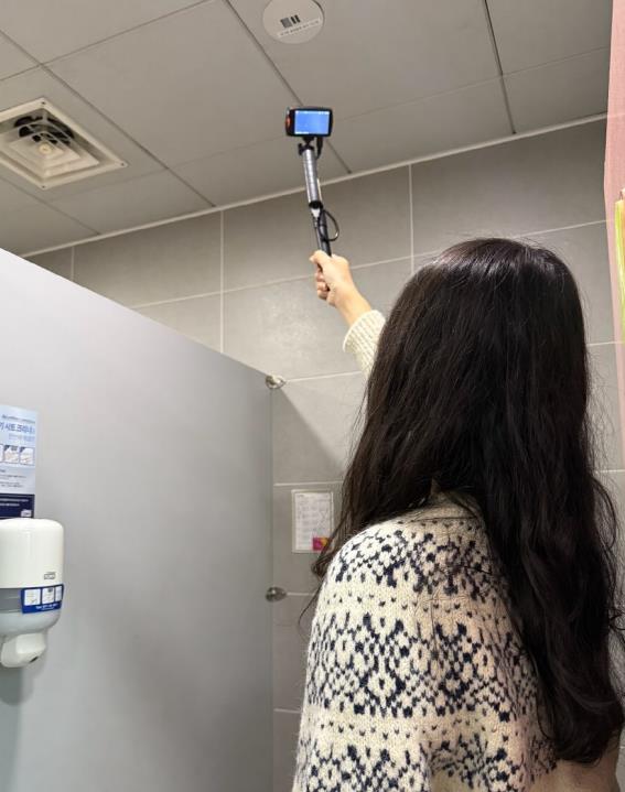 | ▲ 불법 촬영 탐지기로 화장실 점검을 실시하고 있다. |