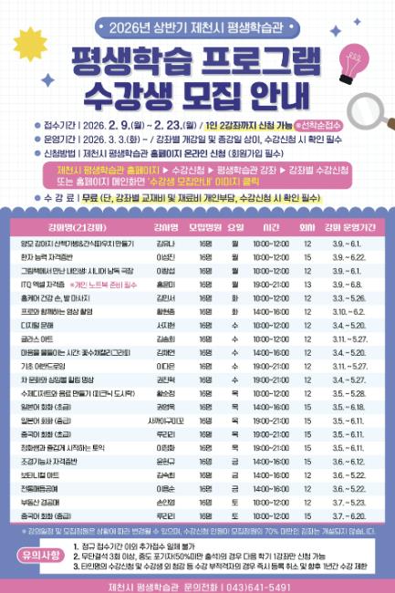 [메이저뉴스]제천시가 2월 23일까지 2026년 상반기 평생학습관 프로그램 수강생을 모집한다.