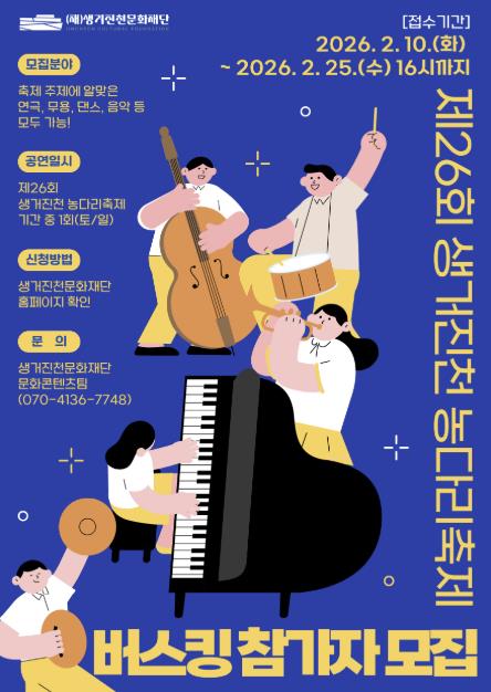 [메이저뉴스](재)생거진천문화재단은 관내 문화예술인의 창작활동 기회를 확대하고 관광객들에게 다채로운 공연을 선보이기 위해 오는 25일까지 ‘제26회 생거진천 농다리축제’ 버스킹 공연 참가자를 모집한다.