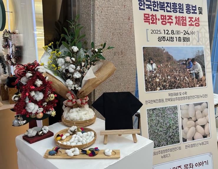[메이저뉴스]한국한복진흥원 입주기업 누미한은 12월 8일부터 12월 24일까지 진흥원 내 목화밭에서 재배한 목화솜과 명주천을 활용한 체험형 전시를 상주시청 로비에서 진행한다.