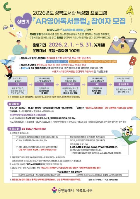 [메이저뉴스]용인특례시 성복도서관은 오는 16일부터 2026년 ‘AR(Accelerated Reader)영어독서클럽’ 상반기 참여자 100명을 모집한다고 15일 밝혔다.