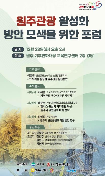 [메이저뉴스]원주시는 오는 23일 오후 2시, 기후변화대응교육연구센터 2층 대강당에서 ‘원주관광 활성화 방안 모색을 위한 포럼’을 개최한다.