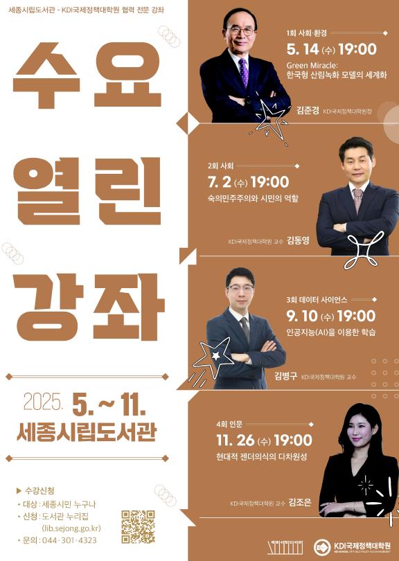 수요열린강좌는 한국개발연구원 국제정책대학원과의 협력을 통해 시민들에게 전문성과 공공성을 갖춘 심화 교양 프로그램을 제공하기 위해 마련된 것으로, 총 4회차로 구성됐다.