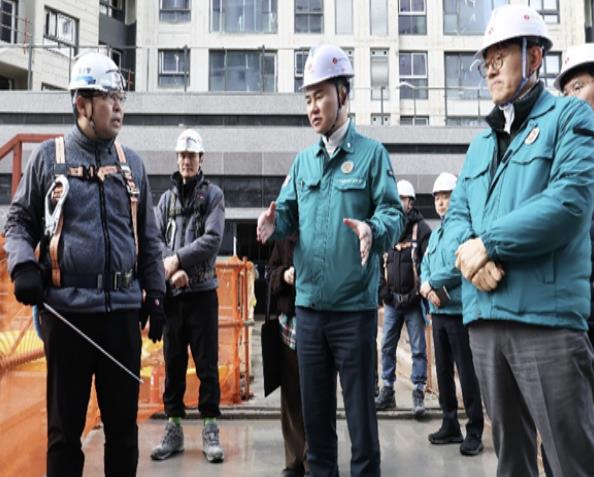 ▲ 오언석 도봉구청장(가운데)이 지역 대형공사장을 찾아 현장 관계자에게 근로자 안전관리 준수 등을 강조하고 있다. |