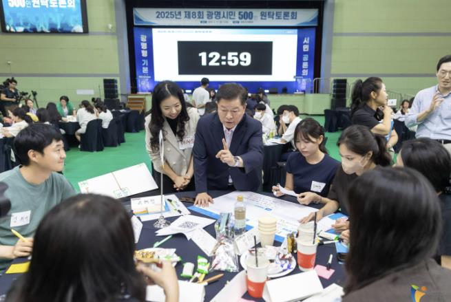 | ▲ 박승원 광명시장이 지난 9월 광명시민체육관에서 열린 '제8회 광명시민 500인 원탁토론회'에서 시민들과 함께 정책을 논의하고 있다. |