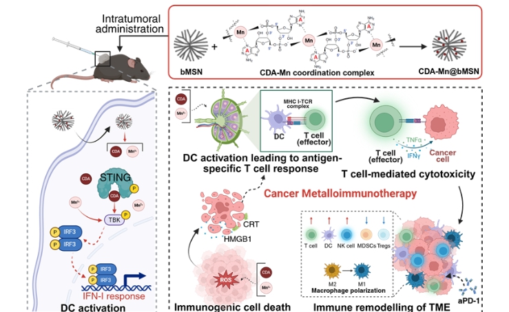 생분해성 실리카 나노입자는 종양 미세환경 내에서 서서히 분해되어 망간과 CDN을 방출하고, 방출된 망간과 CDN은 면역원성 암세포 사멸을 일으킴과 동시에 수지상세포의 STING 경로를 강하게 자극하여 T 세포의 활성을 유발하는 in situ 항암백신 효과를 나타냈다.