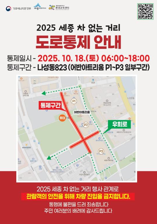 이날 한마당 행사가 진행되는 18일 오전 6시부터 오후 6시까지는 나성동 어반아트리움과 백화점 부지 사이 약 400m 구간 도로에서 차량이 통제된다.