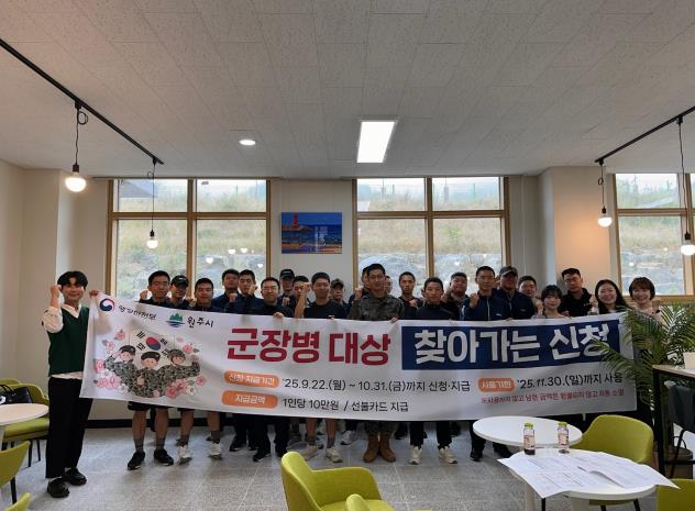 [메이저뉴스]원주시는 9월 30일부터 10월 1일 이틀간 군 장병 대상 “찾아가는 신청”을 접수받기 위해 항공사제71항공정비대대, 1군지사 2곳을 방문했다.