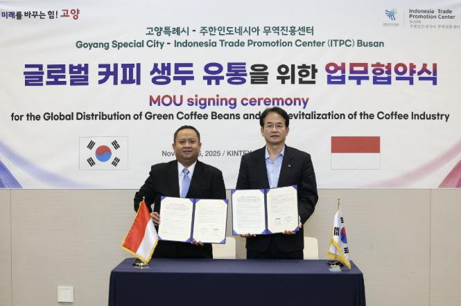 [메이저뉴스]고양특례시는 지난 6일, ‘2025 카페·베이커리페어 시즌2’가 열리고 있는 킨텍스에서 주한인도네시아 무역진흥센터(ITPC 부산)와 ‘글로벌 커피 생두 유통 협력 협약’을 체결했다.