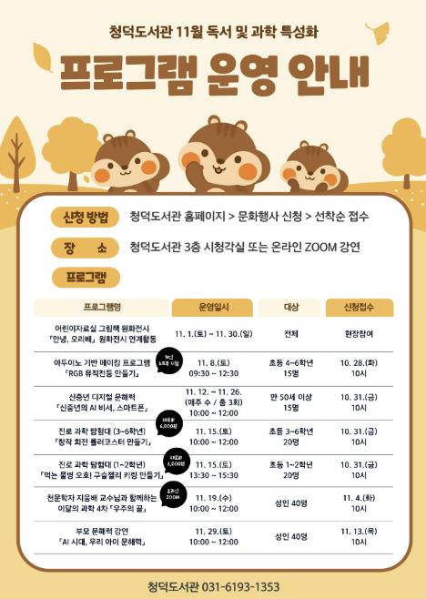 [메이저뉴스]용인특례시 청덕도서관은 11월 한 달간 다양한 과학 특성화 강의와 문해력 프로그램을 운영한다고 10일 밝혔다.