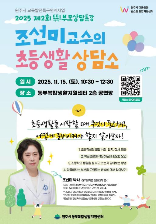 아주대학교 의과대학 조선미 박사가 초등 자녀의 발달 특성과 학교생활 적응을 돕는 방법 등을 주제로 강연을 진행할 예정이다. 1부에서는 ‘우리 아이의 발달 단계 이해와 학교생활 지원법’을 중심으로 한 강연이 펼쳐지며, 2부에서는 이지은 아나운서와 함께하는 현장 토크 형식의 단체 상담이 이어진다.