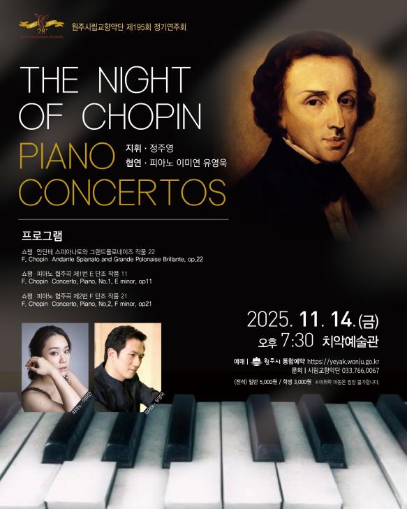 [메이저뉴스]원주시립교향악단은 오는 14일 오후 7시 30분, 치악예술관에서 제195회 정기연주회 ‘The Night of CHOPIN’을 개최한다.