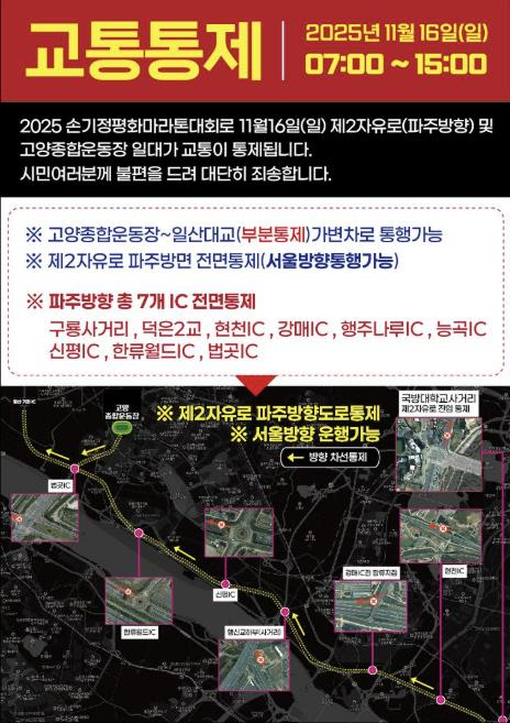 이에 따라 대회가 열리는 16일 고양종합운동장 일대, 법곳IC구간과 제2자유로 일부구간의 교통이 통제된다. 특히, 제2자유로 파주 방면의 경우 제2자유로의 시작점인 구룡사거리부터 법곳IC까지 모든 IC의 차량 진입이 통제되니 우회도로 이용이 필요하다. 교통통제 시간은 오전 7시부터 오후 3시까지이다.