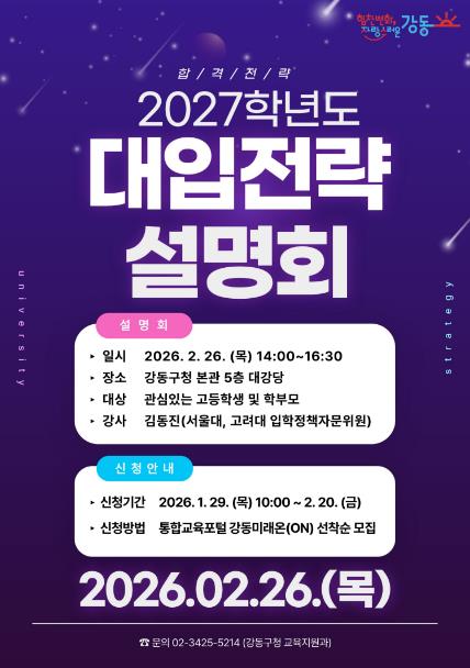 [메이저뉴스]서울 강동구가 2027학년도 대학입학전형에 대비한 올해 첫 대입전략설명회를 오는 2월 26일 강동구청 5층 대강당에서 개최한다고 28일 밝혔다.