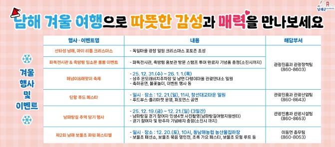 [메이저뉴스]남해군은 겨울 여행 관광객 유치와 체류형 관광 활성화를 위하여 다양한 매력적인 행사 ․ 이벤트를 개최한다.
