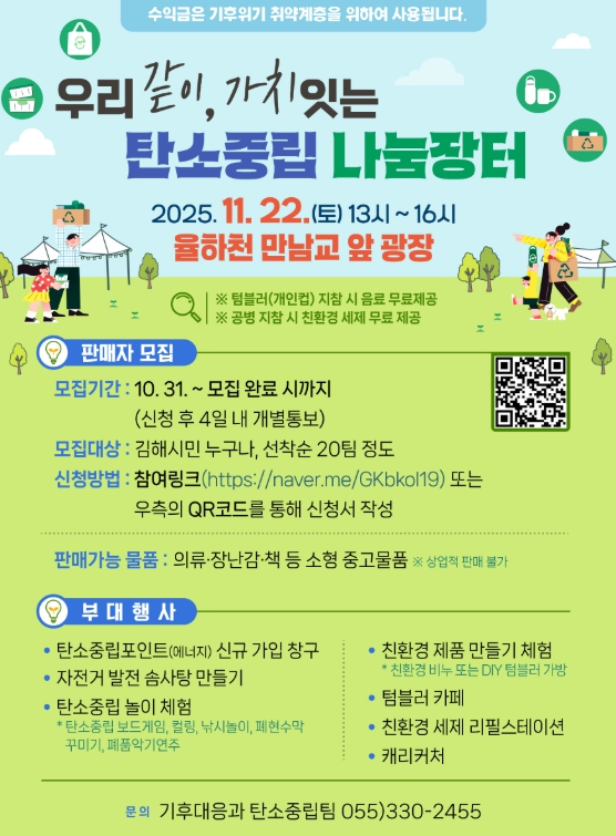[메이저뉴스]김해시는 김해시기후환경네트워크와 함께 오는 22일 율하유적전시관 앞 광장 일원에서 ‘우리 같이, 가치 잇는 탄소중립 나눔장터’를 개최한다고 20일 밝혔다.