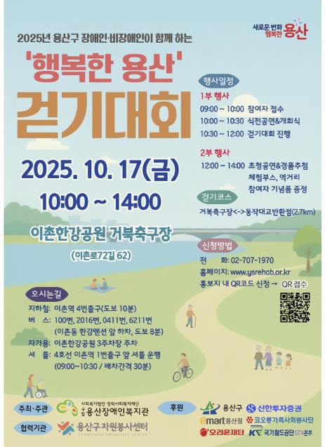 [메이저뉴스]서울 용산구가 오는 17일 오전 10시 이촌한강공원 거북축구장 및 산책로 일대에서, 구립용산장애인복지관 주최로 열리는 ‘2025 장애인과 비장애인이 함께 하는 행복한 용산 걷기대회’를 후원한다.