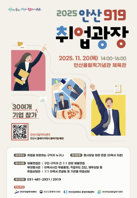 [메이저뉴스]안산시는 오는 20일 ‘2025년 11월 안산 919취업광장’을 안산올림픽기념관 체육관에서 개최한다고 5일 밝혔다.