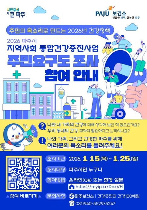 [메이저뉴스]파주시는 시민의 건강한 삶을 지원하기 위해 '2026년 지역사회 통합건강증진사업’추진에 앞서 주민건강요구도 조사를 실시한다.
