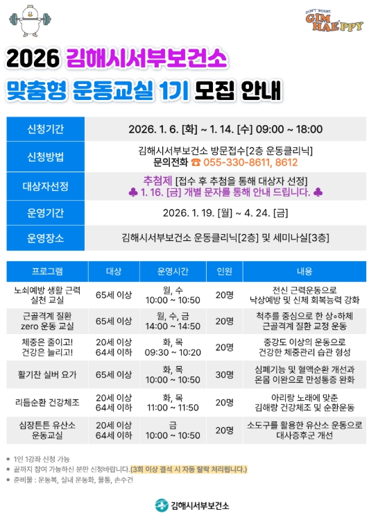 [메이저뉴스] 김해시서부보건소에서 1월 6일부터 14일까지 『2026년 맞춤형 운동교실 1기』 신규 참여자를 모집한다.
