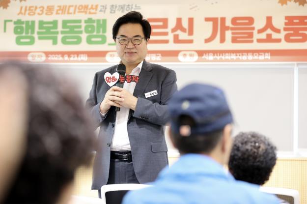 | ▲ 지난 9월, 박일하 동작구청장이 사당3동 레디액션과 함께하는 ‘어르신 동행 가을 나들이’ 출발 전, 안전한 여행을 기원하며 인사하고 있다. |
